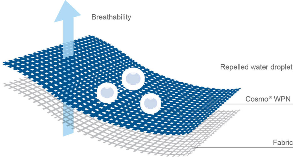 Cosmo® WPN Fluorine-free durable water repellent is a functional finish that adds liquid-shedding properties to fabrics, causing droplets to bead and roll off the surface. The comfort of the finished garment is of utmost concern, so breathability and air permeability of the treated fabric is preserved.